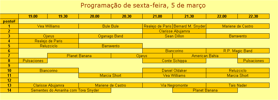 Bahia - Bernard M. Snyder - Bule Bule - Biancorino - Clarisse Abujamra - Conte Schippa e Contessa - Daniel Oldaker - Grupo Barravento - Marcia Short - Mariene de Castro - Ojarus - Ôganagô Band - Planet Banana - Pulsaciones Coloridas - Realejo de Paris - Reluzciclo - R. P. Magic Band - Sean Dillon - Sementes do Amanha com Tova Snyder - Tais Nader - Vea Williams - Via Negromonte |